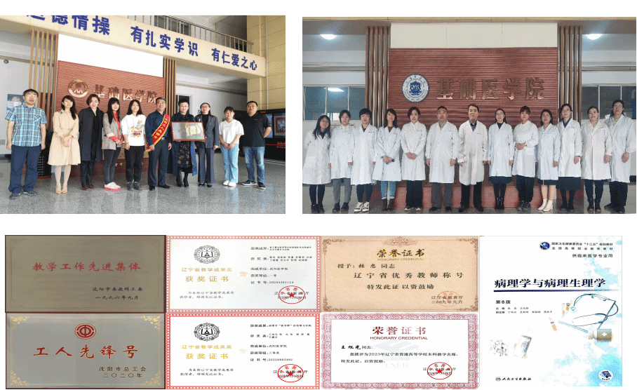 教研室承担包括硕士研究生、职工、本科生在内的各专业病理学以及整合基础医学等的教学任务。先后获得辽宁省教学成果一等奖2项、二等奖2项、三等奖3项。近五年,发表教改论文10余篇,主编、副主编或参编专著及教材共10余部,其中2部分别获评国家“十三五”、“十四五”规划教材。团队目前主要研究方向:(1)消化系统肿瘤相关机制的研究;(2)肿瘤血管的形成及肿瘤侵袭、转移机制的研究;(3)细胞间缝隙连接在疾病发生、发展及治疗中作用的研究。近五年来,共获得国家自然科学基金1项,省部级及其他科研课题9项,发表学术论文38篇,SCI收录11篇,中文核心期刊27篇。培养硕士研究生10人,其中1人获得“沈阳市优秀研究生”称号。