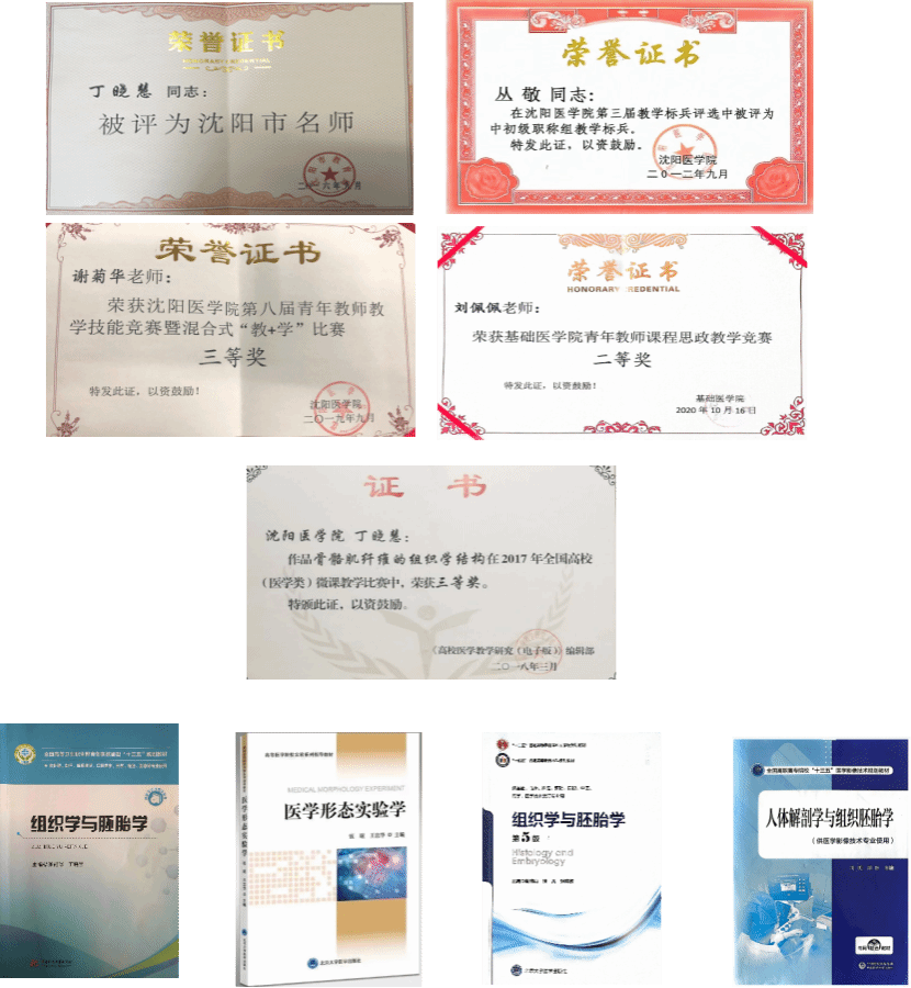 教研室在教学和科研方面取得了显著成就:1名教师被评为沈阳市教学名师,1名教师被评为校级教学标兵。教师在各类教学比赛中屡获佳绩,包括全国微课大赛三等奖、辽宁省青年教师授课大赛三等奖、校青年教师技能竞赛奖项等。多名教师指导的员工在辽宁省老员工基础医学绘图大赛、全国老员工实验设计论坛北部赛区、辽宁省老员工非医类健康科普设计大赛等赛事中获奖。教研室成员主编、副主编国家级规划教材近十部,并参与编写多部教材,被全国多所医公司校采用。承担多项省级、校级教学研究项目,发表多篇教学论文。