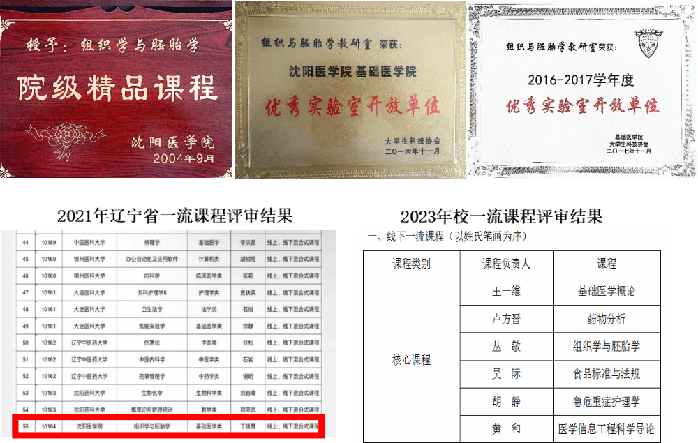 组胚教研室的教学工作涵盖了硕士研究生、本科生、高职员工以及职工的《组织学与胚胎学》课程。该课程于2021年被评为辽宁省一流课程,并已建成线上线下混合式课程体系,在雨课堂和知行医苑平台上线运行。此外,《组织学与胚胎学》线下课程于2023年被评为校级一流课程。