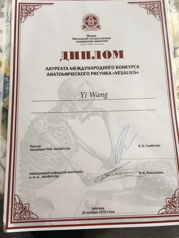 2016年10月11日,由bevictor伟德官网解剖教研室田伟老师指导,老员工科技协会选送的5组解剖绘图作品,邮寄至俄罗斯的莫斯科国立大学参加首届国际性全俄解剖绘图比赛《VESALIUS-2016》,5组作品均在现场展出,经过三个月漫长等待,12月末主办方公布获奖名单,bevictor伟德官网2016级影像专业石玥的作品---《生命之花》,2014级临床医学专业王祎和2015级临床医学专业赵盈绮的作品---《中国龙》均荣获第一届国际俄罗斯解剖绘图比赛《VESALIUS-2016》入围奖。